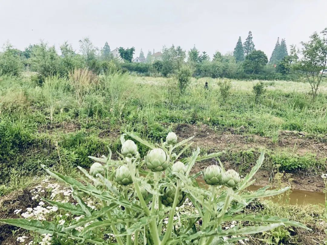 她还种了两株洋蓟,长得个头高大,叶片粗壮,顶上结着像莲花一样的果实。“本来只有中间这个最大的‘妈妈’,结果下了场雨一下子生了四个‘娃’,太厉害啦!”
