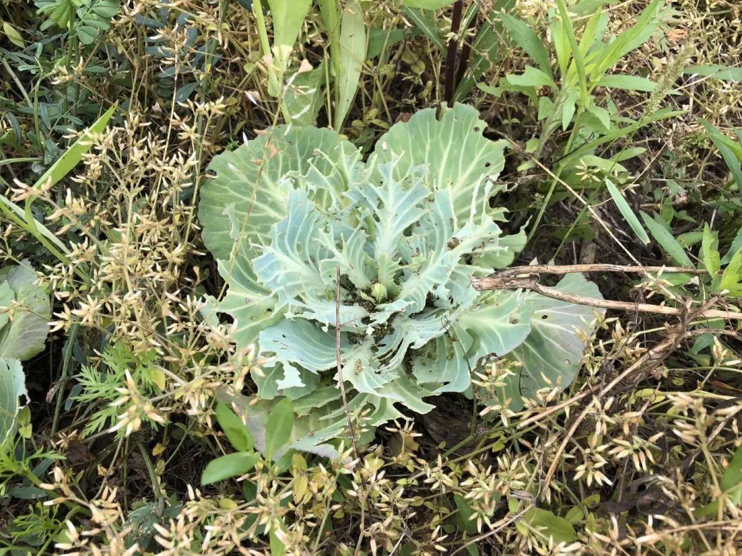 因为不用农药不驱虫,大福种的几棵卷心菜被虫子啃得面目全非,他看得心疼,但还是说,“虫子吃完我们再吃,放心”。