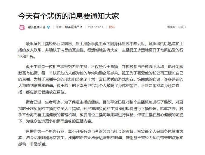 “孤王”所在直播平台“触手”随后发布消息,证实其去世一事,并称“孤王殿下的不幸离世给每个人敲响了身体的警钟,不管是游戏本身还是直播,都应该把健康放在首位。”平台同时表示,为了保证主播的健康,目前平台已对整个主播机制进行了整改,对直播时长超负荷的主播将给予人工提醒,对严重超负荷的主播拟将进行下播处理,此外将完善主播健康的管理机制。