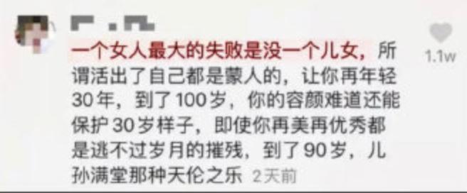 该网友在杨丽萍的视频下评论称:“一个女人最大的失败是没有一个儿女”,并获1.1w赞。
