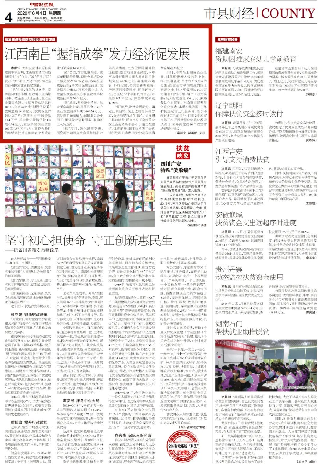 6月4日,《中国财经报》在市县财经版以“江西南昌‘握指成拳’发力经济促发展”为题,深入报道“我市财政积极面对疫情不利影响,通过‘扶’企业、‘减’负担、‘稳’就业、‘抓’项目、‘促’消费等措施,推进全市经济恢复健康稳定发展”的有关情况。以下是报道内容: