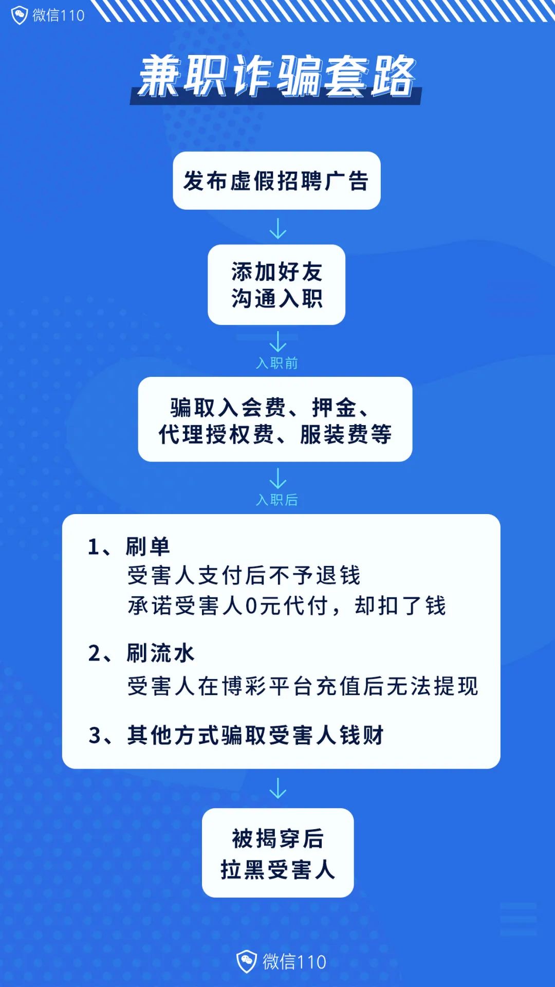 骗子经常会用门槛低、时间自由、高佣金等招聘条件吸引受害人注意。在此提醒广大用户,不要轻易相信这类“不劳而获”的兼职广告,尽可能通过正规的招聘网站求职应聘。