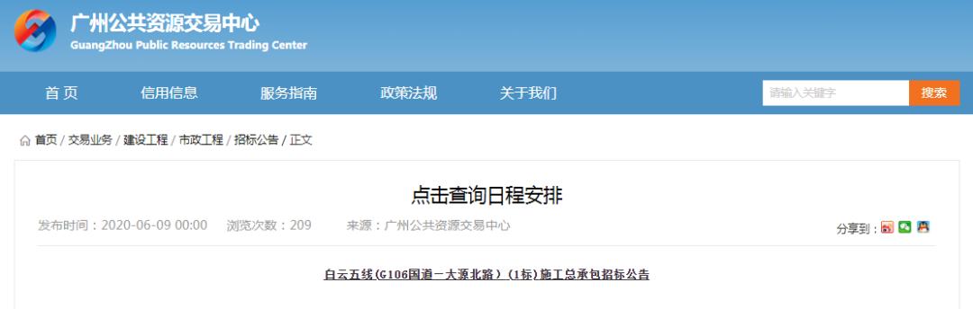 6月9日,广州公共资源交易中心发布公告,白云五线(G106国道—大源北路)(1标)启动施工总承包招标。