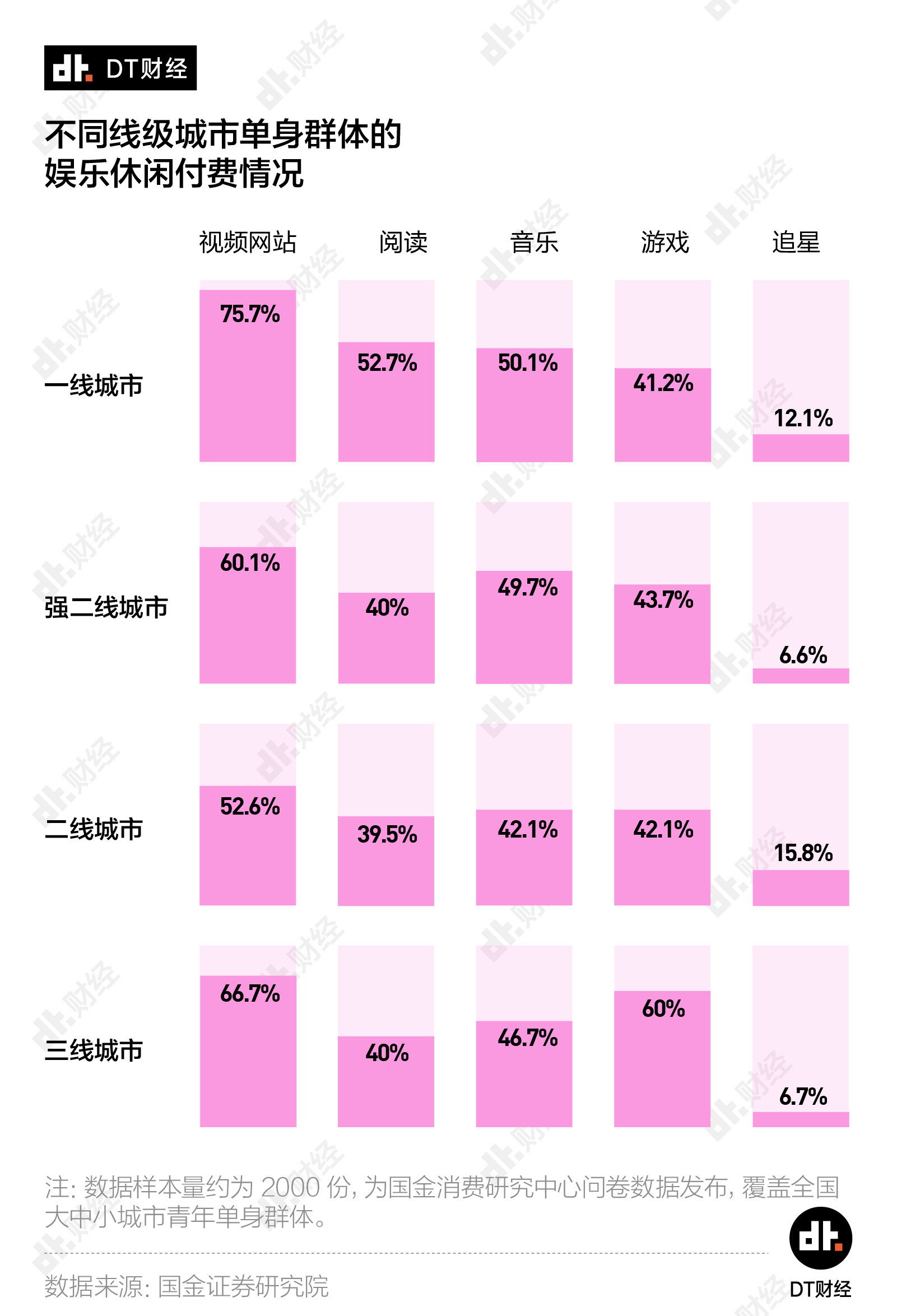 英敏特在2017年推出的营销报告中指出,六成(61%)单身消费者最感兴趣的领域就是电影/电视剧。对于单身人群来说,为视频网站付费已经成为线上消遣的第一大付费行为。在一线城市,更有超过70%的独居青年在为视频网站付费,远远超过对音乐、阅读乃至游戏的付费比例。