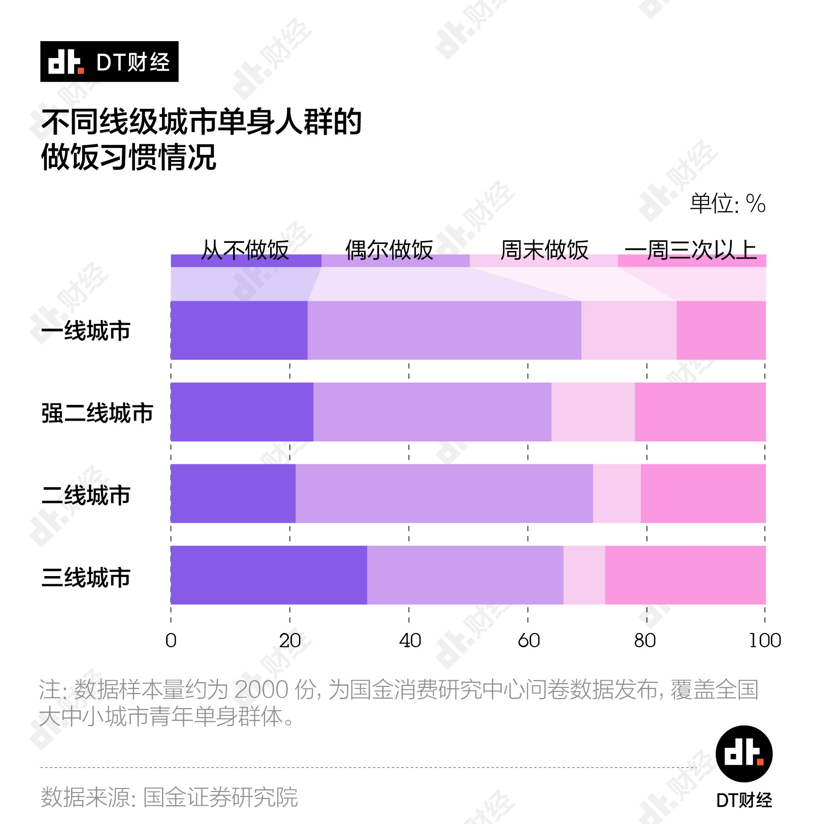 在各线级城市,独居青年们偶尔做饭和从不做饭的比例加在一起都在6成到7成之间。尽管在疫情期间,我们观赏到了年轻人的花式下厨大赛,但回到日常生活中,年轻人尤其是独居群体,更多将厨房视为供奉生活仪式感的场所。考虑到做饭耗费的时间精力,他们更愿意为外卖买单。