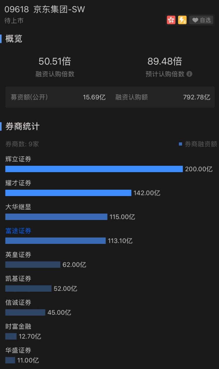 随着618的渐行渐近,京东也紧跟网易的步伐回归港股,目前新股认购情况同样热火朝天。