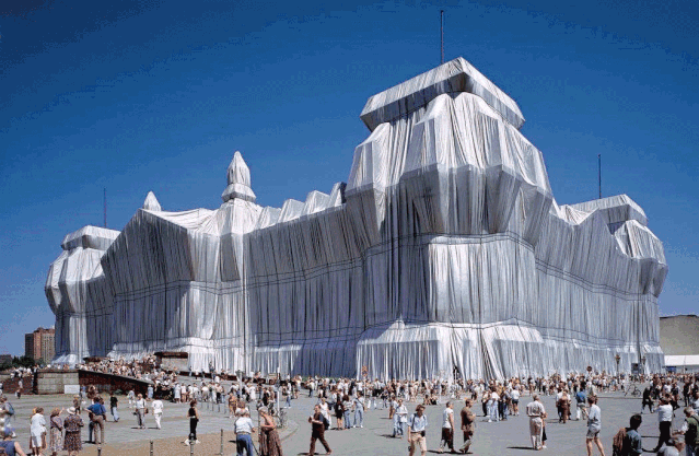 早在1971年,克里斯托和他的妻子就有了包裹这座大厦的想法。但是要将这座高46米、长183米、宽122米的庞然大物进行包裹可绝非易事。不仅涉及技术、资金、人力、工程等问题,还要通过德国议会的层层审批。