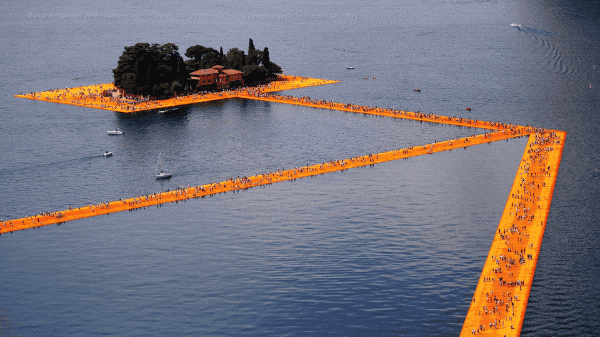 此后,克里斯托以一人之力,在意大利的伊塞奥湖上,完成了这件《漂浮码头》。这件由20万个立方体铺成的路,连接对岸的小镇通往湖心的小岛。以独特的艺术方式,创造了自然界中本被隔断的连接,以彼此熟稔的艺术方式,表达对妻子的无尽思恋。