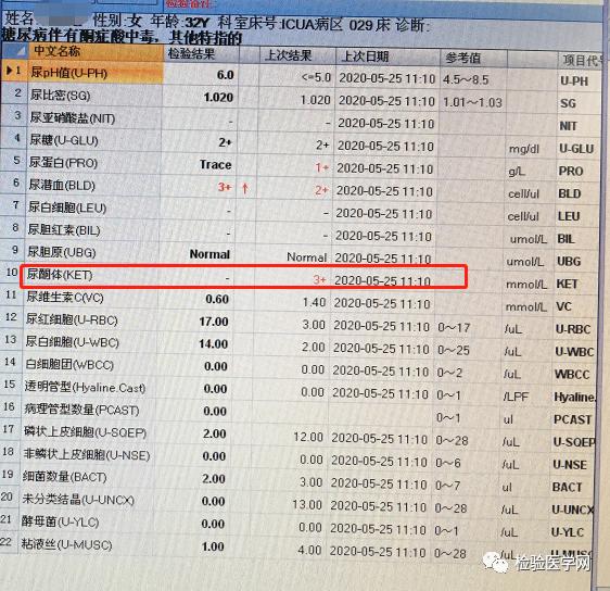 我听到这儿似乎一时也难以置信,甚至对我们自己的检验结果也产生了怀疑,我没有正面回答他,跟医生说我来调查一下,复查之后给您回话。挂掉电话,我立即去Lis系统查阅患者的检验历史,然后查看患者的病程记录,的确患者于2020年5月23日入院,入院时患者的尿糖结果为2+,尿酮体为阴性,治疗2天后(即5月25日),复查尿常规反而显示尿酮体3+,然后今天再次复查尿酮体结果为1+,这是什么原因呢?如下图:
