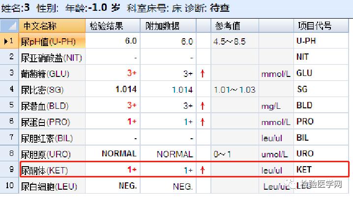 患者,女,32岁,尿糖2+,尿蛋白弱阳性(Trace),尿隐血3+,酮体(KET)前一天3+,今日检测为阴性(-),如下图:
