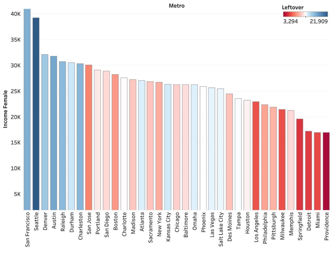 下面是一个柱状图,其中柱的高度代表女性收入,单位为千美元;蓝色代表能“剩下”更多,而红色代表剩下更少。(注:为了查看方便,仅选取了一些比较有代表性的城市。)