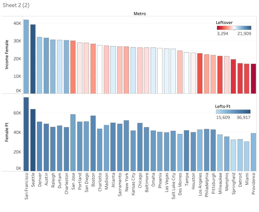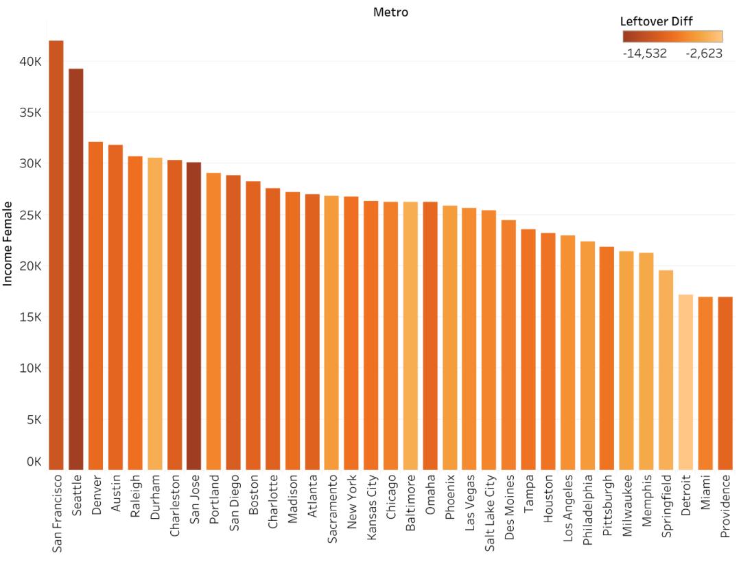 这种差距在美国各个地方也有区别。让人意外的是,在西雅图、湾区这样的地方,虽然女性收入高,但是男性收入更是不成比例的高,导致男女收入的差距十分大。投入全职工作、扣除育儿和税之后“剩下”的钱,男女差距最大的是西雅图,其次是圣何塞;圣地亚哥、旧金山等地紧随其后。反而是底特律、巴尔的摩、孟菲斯这样的“大老粗”城市,差距较小。