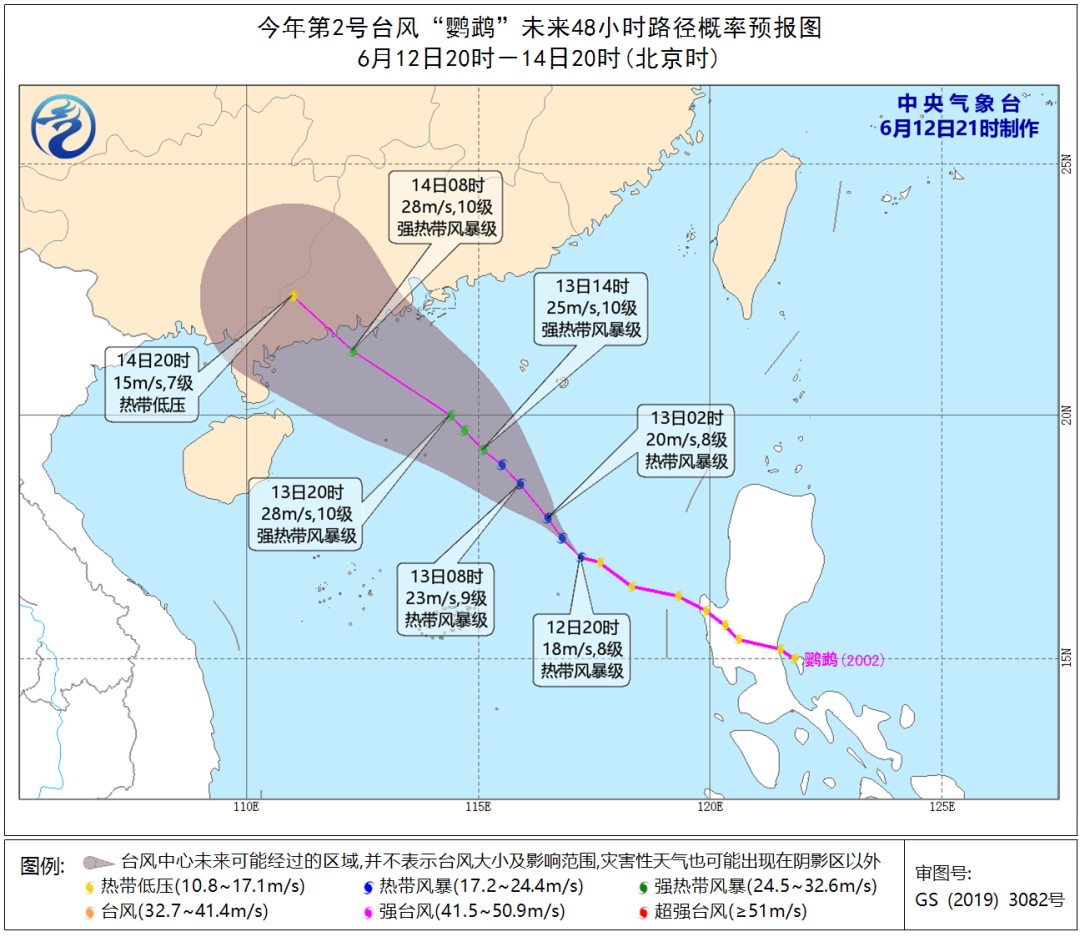 中央气象台刚刚宣布:南海热带低压已于今天(12日)晚上加强为今年第2号台风(热带风暴级;英文名称:Nuri;中文名称:鹦鹉;名字来源:马来西亚;名称意义:一种蓝色冠羽的鹦鹉),20时其中心位于广东省阳江市东南方约760公里,北纬17.1度、东经117.2度,8级(18米/秒),998百帕。预计,“鹦鹉”将以每小时15-20公里的速度向西北方向移动,强度逐渐加强,预计14日中午前后在广东深圳到徐闻一带沿海登陆(23-28米/秒,热带风暴级或强热带风暴级)。
