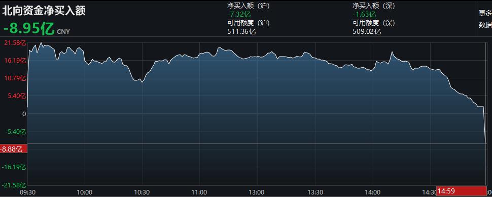 Wind数据显示,北向资金高开低走,全天净卖出8.95亿元,终结连续14日净买入;其中沪股通净卖出7.32亿元,深股通净卖出1.63亿元,且尾盘集合竞价深股通净卖出额近10亿元。