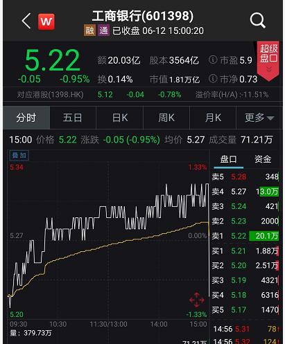 工商银行A股集合竞价被砸盘,成交超71万手,成交价5.22元,股价由涨1%至收跌0.95%。