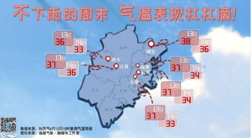 周末两天气温仍保持较高,尤其是中北部大部分地区午后高温在35℃以上。其余地区在30-35℃。同时,未来三天我省处于副高边缘,部分地区多阵雨或雷阵雨。13-14日,我省大部有阵雨或雷阵雨,南部沿海地区部分中雨,局部大雨。闷热的感觉将卷土重来,提醒大家要做好防暑降温工作的同时,外出请携带雨具。