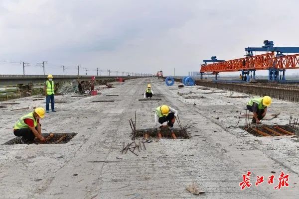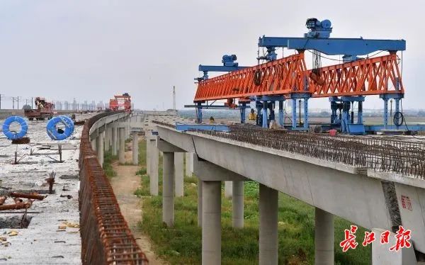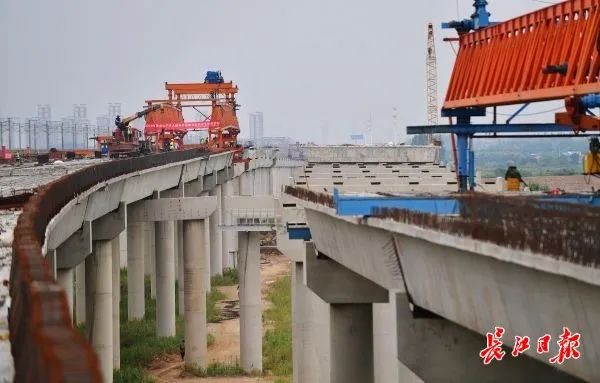 12日上午,记者来到位于孝感与武汉交界处的界河桥梁施工现场探访,两台架桥机正同步施工,将一片片预制梁安放在桥墩之上,不断向孝感方向挺进。记者抬头远望,孝感闵集方向的高楼清晰可见,工地旁则时不时有动车从汉孝城际铁路上驶过。可以预见,陈天大道(武汉市区界—孝天公路)通车后,将成为两地除铁路外的又一重要交通动脉。