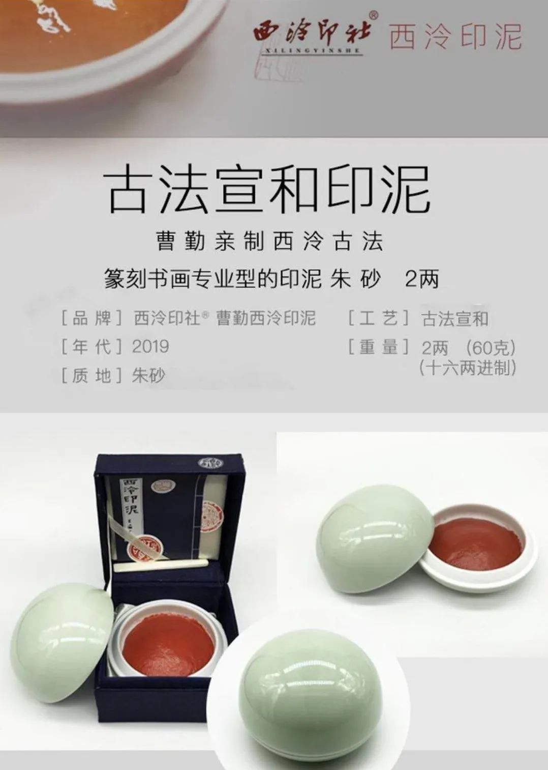 西泠印泥由天然蓖麻油、艾叶、朱砂3种原材料,经过晒油、选砂、飞朱、研朱、制艾法、印色法等上万次的手工调和而成,有朱磦、丹顶、金桂、金碧、牡丹、光明、缨绶、美红、箭砂等30多个品种,具有色泽古雅、质地细腻,丰富沉着的特色。