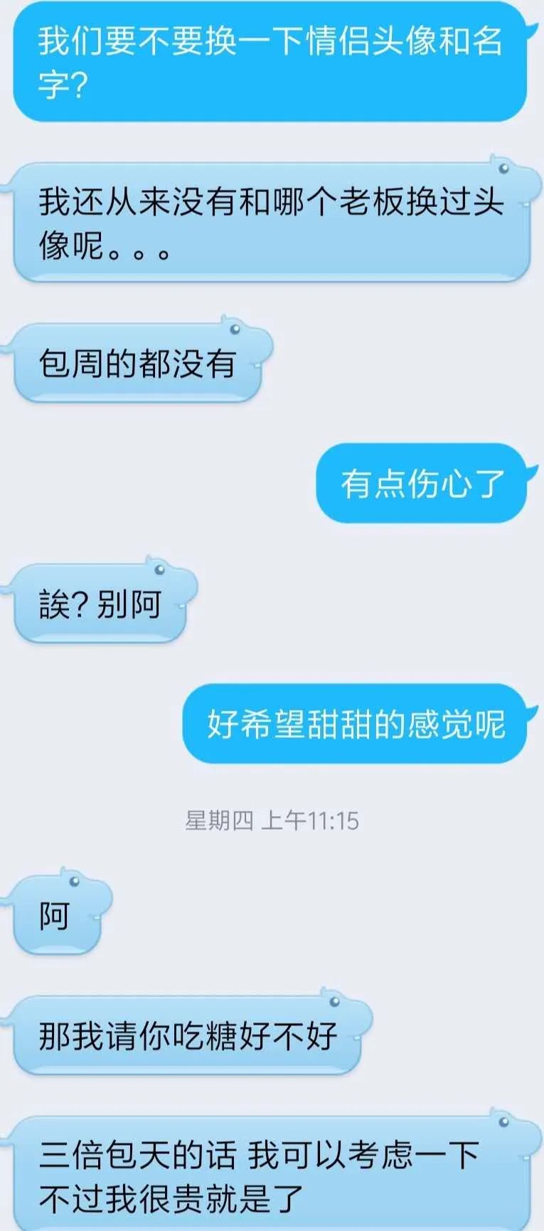 “三倍包天的话,我还是可以考虑一下的。总之,我很贵。”男友在微信那头有理有节的说。他算了一笔,按照他文字+语音包天陪聊220块的价格,三倍就是660,为了彰显甜蜜气氛,他可以打个七八折,以520块的优惠价提供更换微信头像和昵称服务。