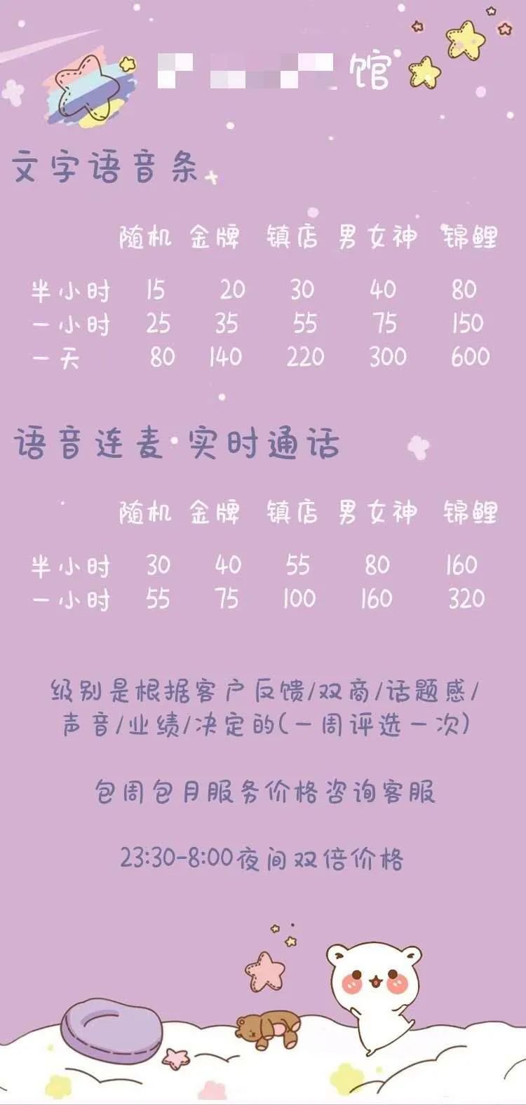 以纯一所在的店为例,随机分配的“男友”文语包天聊天价格为80元,镇店220元,锦鲤则需要600元。而语音连麦的价格则分别为,随机通话一小时30元,镇店100元,锦鲤320元。包月包周的费用最高可达上万元。收益由接单人与店家平分。