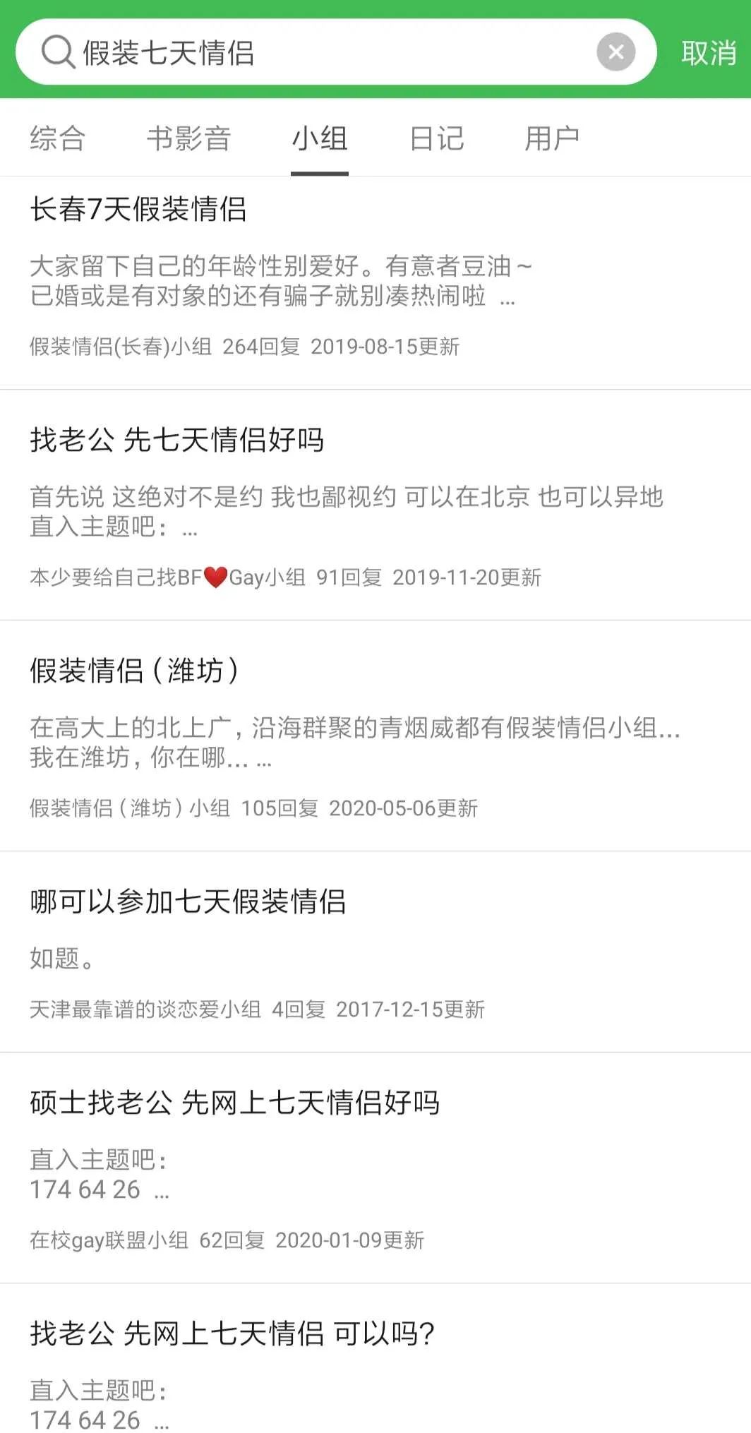 油腻、套路则是第二个风险。继豆瓣北京、上海出现“七天情侣”小组之后,“假装情侣”小组的“分店”遍布宁波、长春、唐山、潍坊等三四线城市,女孩被目的不纯的男性骗色的帖子随处可见。