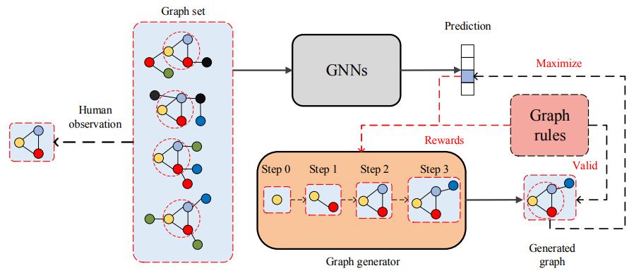 在这项研究中,来自德克萨斯 A&M 大学(TAMU)和密歇根州立大学的研究者提出了一种新的方法,称为 XGNN,在模型级别上解释 GNN。特别地,他们提出通过训练图生成器来解释 GNN,使生成的图模式最大化模型的某种预测。研究者将图形生成表示为一个强化学习任务,其中对于每一步,图形生成器预测如何向当前图形中添加一条边。此外,他们还添加了一些图规则,使生成的图有效。