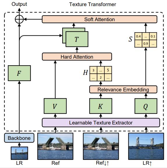 这种设计鼓励低分辨率(LR)和参考(Ref)图像之间进行联合特征学习,其中深度特征对应关系可以通过注意力发现,从而可以实现纹理特征的准确迁移。本研究提出的纹理 Transformer 能够以跨尺度的方式实现进一步堆叠,进而实现不同级别的纹理恢复。