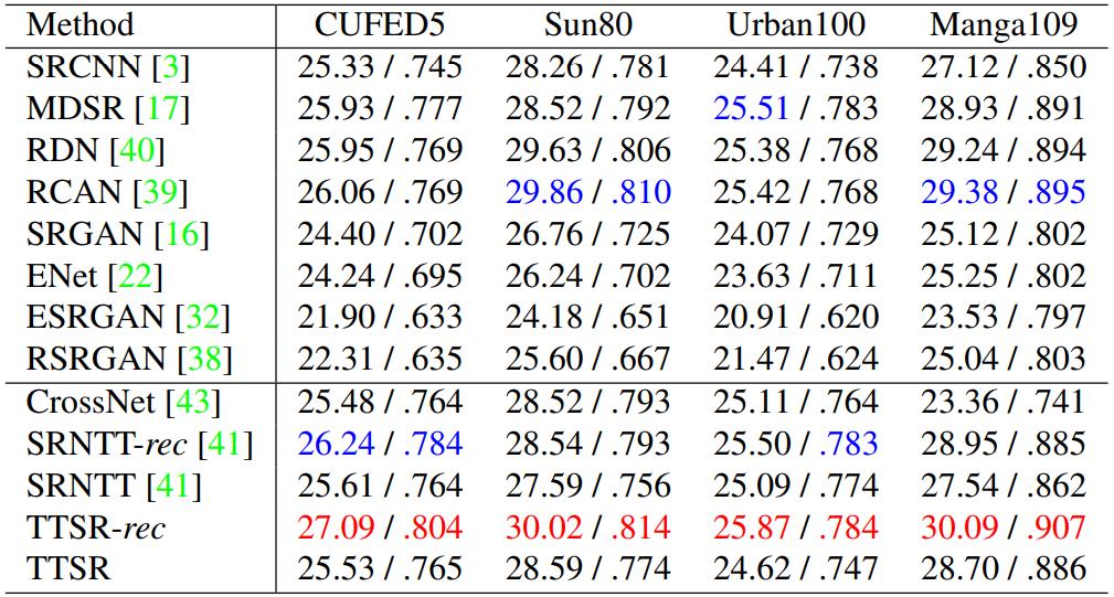 推荐:大量的实验表明,TTSR 在定量和定性评估两方面较当前 SOTA 方法均有显著提升。