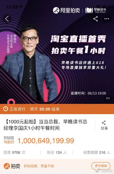 对了,李国庆的午餐最终的拍卖价格是12万左右,而从10亿,到12万,只用了1天。