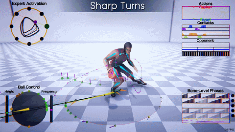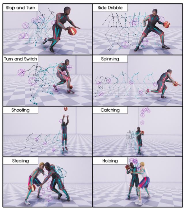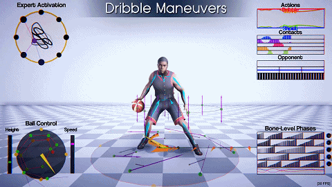 系统经过篮球比赛中大量的运动捕获数据训练之后,用户就可以交互地控制角色,来生成迅速且异步的篮球技巧,例如运球、佯攻、抢断、防守等,这对于电脑游戏和 VR 运动训练是很有用的。