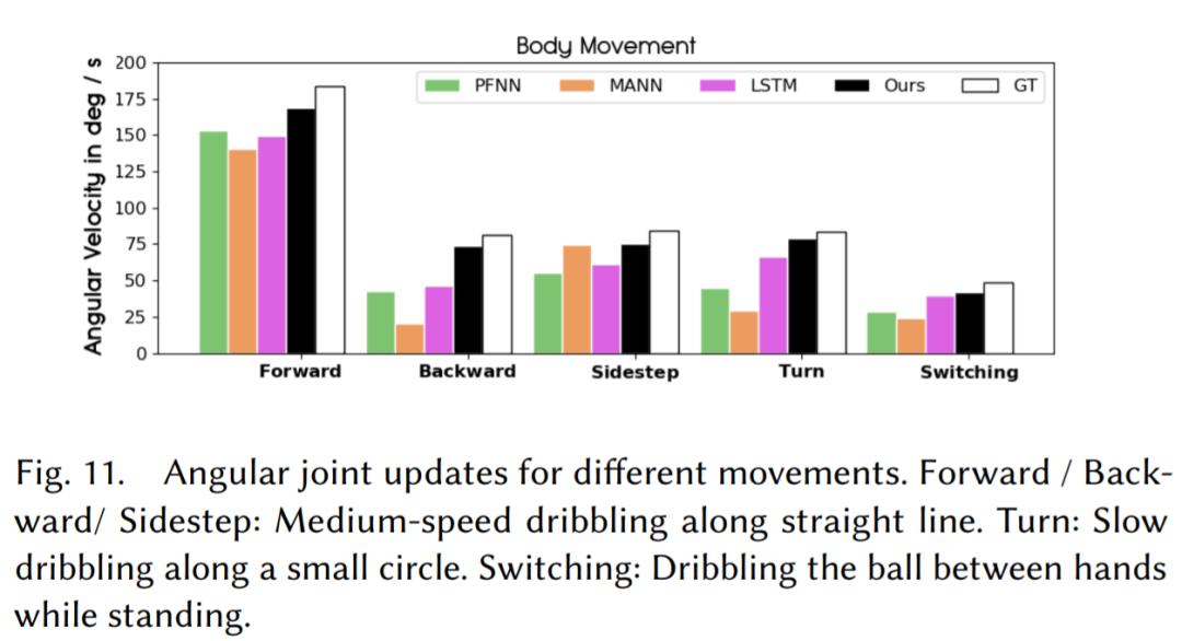 下图 11 将该研究方法与 PFNN、MANN 和 LSTM 做了比较,结果显示在所有动作样式上表现更佳。并且,在后退和转向此类数据样本更加稀疏的情况下,差异更加明显。
