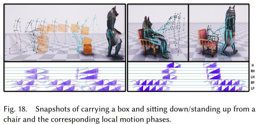 每个和其他物体或环境接触的骨骼的局部运动相位是单独计算的,并且能够给四肢的动作进行异步编码。这和 [Starke et al. 2019] 的研究完全不同,在 [Starke et al. 2019] 的研究中,研究者假设每一个动作都由一个全局相位变量进行同步,这需要仔细的标注过程,或者定义有关动作何时开始和结束的明确规则。这些工作有时非常困难,甚至是模棱两可的。而局部运动相位是基于单个骨骼的接触、以统一的规则进行计算的,并且易于自动计算。