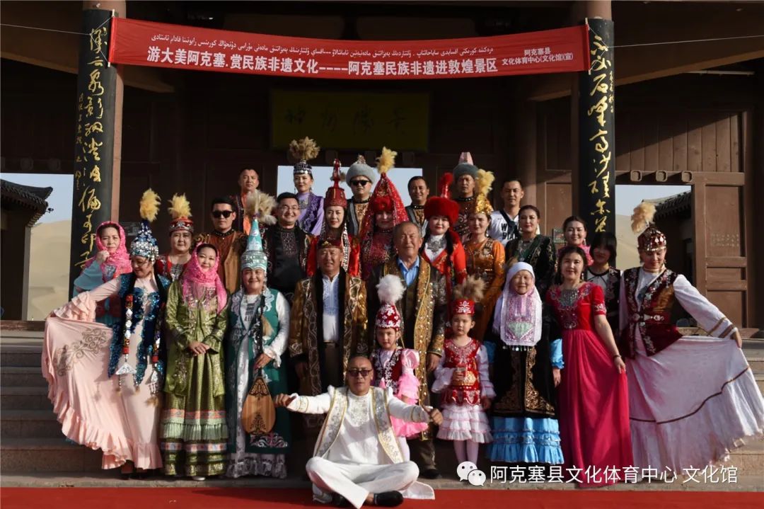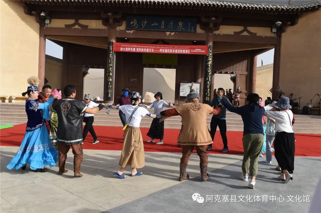 敦煌月牙泉景区、敦煌风情城参与展演的传承人不顾炎热的天气,盛装出场,哈萨克族劳动舞、民歌、服饰,让在场的游客领略了一场近距离的民族文化大餐,展演间组织的黑走马舞蹈参与体验活动,许多游客在展演人员的邀请下,纷纷登场参与,充分感受了哈萨克族民族的独特的民族文化。