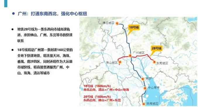 在交通方面,早期的南沙规划工业用地、物流,依托港口建港口工业区,而这几年南沙最大的变化是谋划出一个“十字交叉”的人流枢纽出来。深圳修了一条沿海公路到茂名,广州把它按到南沙设站,18号线通下去之后,进一步往中山伸延,这就形成“十字交叉”。过去南沙说它是地理中心,说了几十年,这才实现了中心:是“流中心”不是地理中心让南沙成为中心。广州进一步谋划用28号线把东莞中心区、佛山中心区、广州中心区这北部三大巨头串联起来,广州这个十字中心枢纽的地位就牢牢控制住了在“流空间”的中心性。