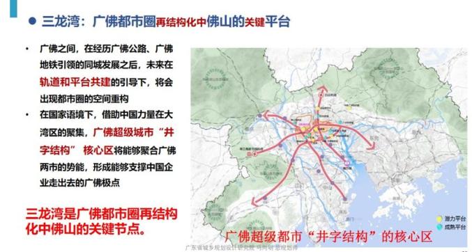 第一,在发展定位方面,三龙湾要融入大湾区创新网络里面去,这是肯定的事情,但创新功能的发挥需要有很多相关的功能支撑。所以我们要关注广佛超级都市圈的空间再结构化的机会。在两市地铁和平台的共同引导下,广佛都市会出现“井字”型结构。这个“井字”结构核心区能够聚合广佛两市的势能,形成能够支撑中国企业走出去的广佛极点。前期千灯湖跟佛山旧机场挪开之后,通过28号线串联成平行带,这条带是东西向的上面一条。下面这条带是三龙湾+广州南站的国际创新,这是第二条东西向的带。这两条带一叠加,广佛超级都市就形成“井”字型结构,各自有一条南北轴,广州一直拉到南沙,佛山也是一条南北轴下来,加上两条东西轴,三龙湾是佛山在这个结构中关键的一点。