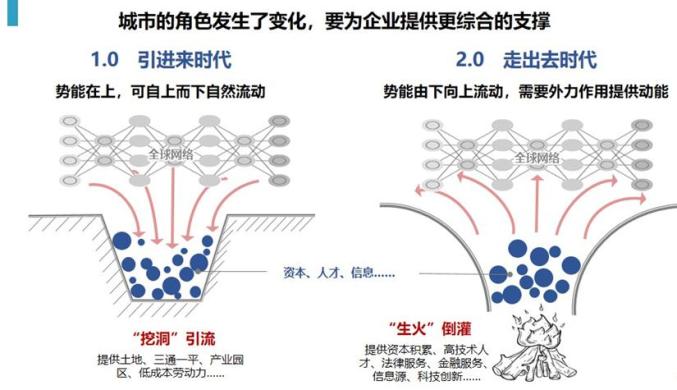 概括起来就是这张图,过去我们是“引进来”的时候,只须提供一个生产空间、水电加廉价的劳动力;将来我们的企业要成为跨国公司,自带(资金、技术、人才、产品设计)这一切走出去的时候,城市要提供各方面的支持,哪怕是人才也需要城市的支持,这就是巨大的变化。以工业用地扩展为主的GDP时代,只要搞搞园区、交通就行了,当我们要支持企业到世界各地赚钱的时候,这时候园区扩得再大,如果城市支持功能不足,都达不到一线城市的地位,也就只是生产基地。但现在产能过剩,运出去又会面临国际贸易摩擦,靠大量的扩张生产空间、扩大工业用地的时代已经过去了,城市要进入到GNP时代,要到全世界去赚钱,要成为总部。