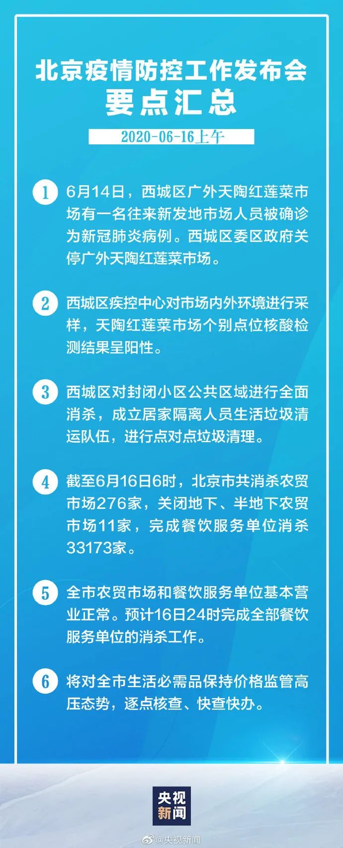 北京市市场监督管理局副局长陈言楷介绍,新发地批发市场聚集性疫情以来,全市农贸市场、餐饮单位开展消杀,截至昨日6时,全市共消杀农贸市场276家,关闭地下和半地下市场11家,完成餐饮服务单位消杀33713家。预计今天0时完成全部餐饮服务单位的消杀工作。
