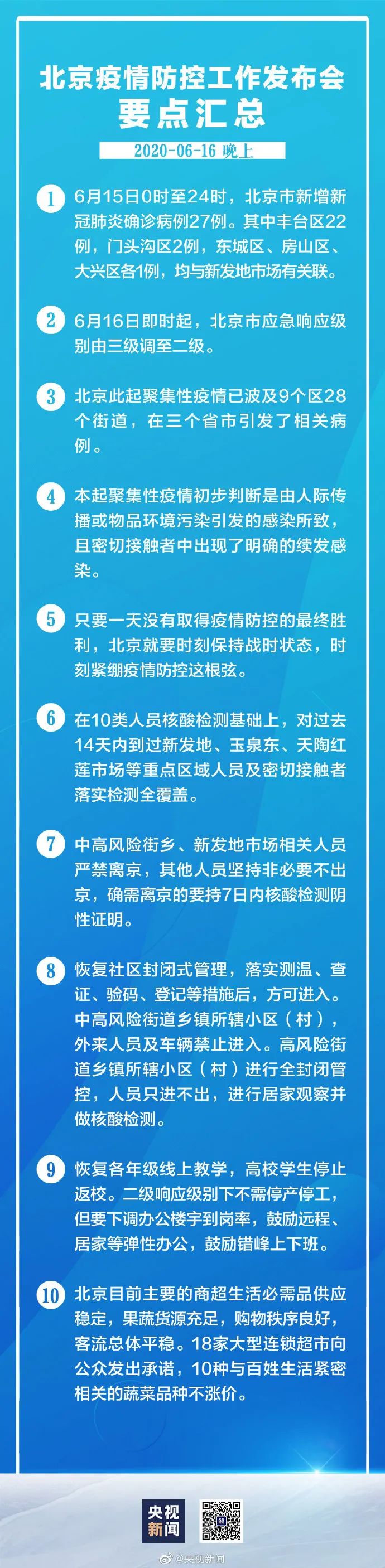 首都疫情防控形势十分严峻,昨天,北京罕见开了三场新闻发布会。北京市政府副秘书长陈蓓通报,北京所有病例均与新发地农产品市场有关联。本起聚集性疫情,初步判断由人际传播和物品污染引发。升级二级响应后,北京严格进出京管控,境外入京人员全部集中观察核酸检测,中高风险街乡、新发地市场相关人员禁止离京,其他人员坚持“非必要不出京”,确需离京的须持7日内核酸检测阴性证明。北京市中高风险街道乡镇所辖小区村,外来人员及车辆禁止进入,高风险街道乡镇所辖小区村进行全封闭管控,人员只进不出,进行居家观察并做核酸检测。二级响应级别下不需停产停工,但要下调办公楼宇到岗率,鼓励远程、居家等弹性办公,鼓励错峰上下班。同时,全国已有多省份发布对来自北京的人员进行隔离的政策。今日,北京首都机场进出港航班近一半取消,已有包括国航、海航在内的多家航空公司提供针对进出京航班提供免手续费退票业务。