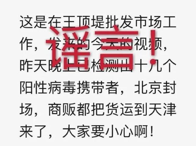 最近,一条“我市王顶堤批发市场已检出十几例新冠病毒携带者”的消息在微信、微博等网络平台传播。昨日,天津市互联网违法和不良信息举报中心官方微博@天津辟谣正式辟谣,与相关部门核实,截止16日早9点,王顶堤批发市场相关人员核酸检测结果均为阴性。