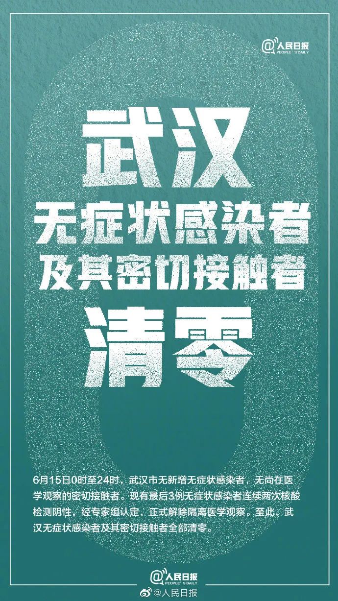 据武汉市卫健委1通报:6月15日0时至24时,武汉市无新增无症状感染者,无尚在医学观察的密切接触者。现有最后3例无症状感染者连续两次核酸检测阴性,经专家组认定,正式解除隔离医学观察。至此,武汉市无症状感染者及其密切接触者全部清零。