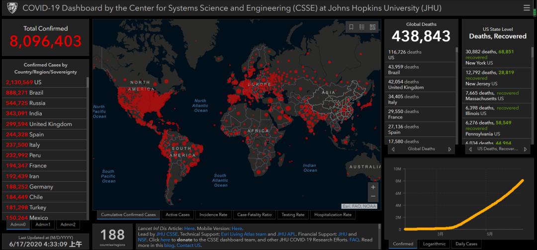 据美国约翰斯·霍普金斯大学实时统计数据,截至北京时间6月17日4时33分,全球新冠肺炎确诊病例累计8,096,403例,死亡438,843例。其中美国确诊超213万,巴西超88.8万,俄罗斯超54.4万,印度超34.3万,英国超9.9万,西班牙超24.4万,意大利超23.7万,秘鲁超23.2万,法国超19.4万,伊朗超19.2是全球确诊病例最多的10个国家。