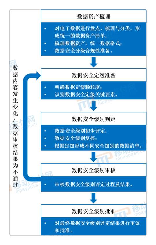 在数据安全分级的过程中,除了分级依据,最受关注大约就是数据安全分级的定级流程问题。目前在《指南》送审稿中,金融数据安全定级过程包括数据资产梳理、数据安全定级准备、数据安全级别判定、数据安全级别审核及数据安全级别批准等五步。