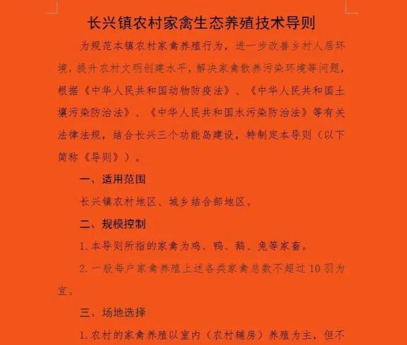 该导则对规范长兴镇农村家禽养殖行为,改善农村人居环境,提升农村文明创建水平,解决家禽散养污染环境等问题起到积极的引导作用。