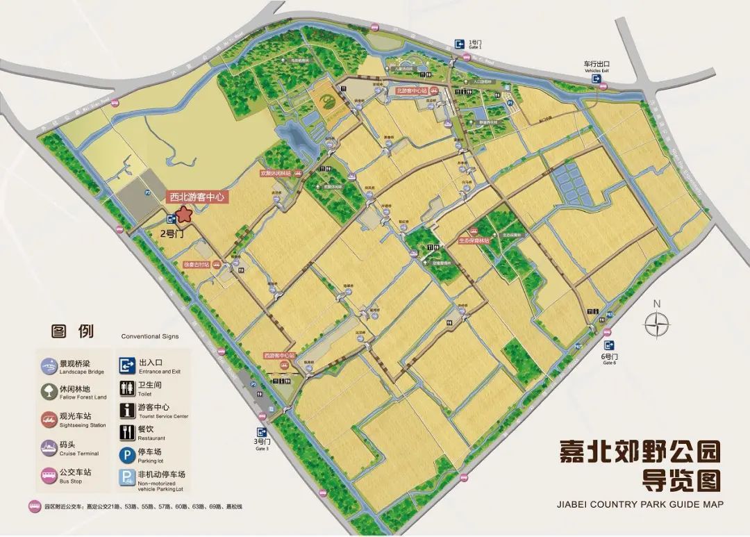 自2020年6月20日起,嘉北郊野公园西北游客中心对外开放。西北游客中心位于园区2号口(嘉松北路),涵盖票务、咨询、母婴、洗手间、饮水机等服务功能。