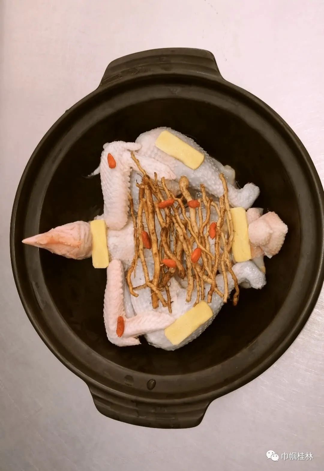 原料:龙胜凤鸡一只(重约3斤),臭牡丹根50克,姜片、枸杞子少量。