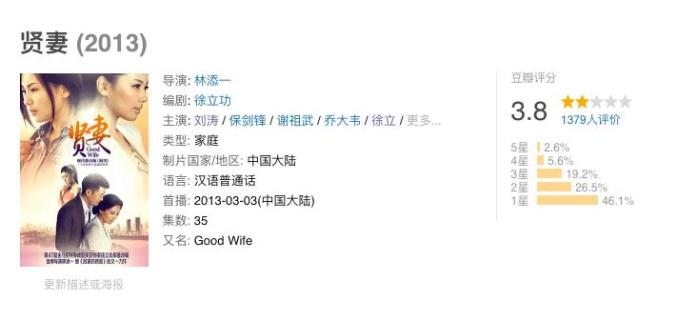 这部电视剧叫《贤妻》,善良的网友打出了3.8的高分。