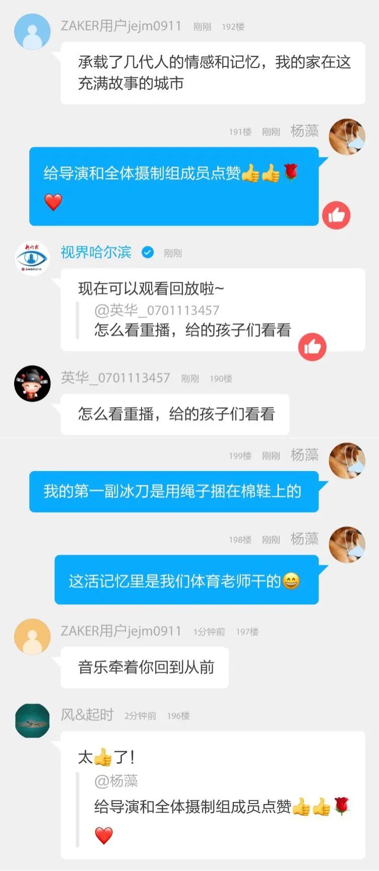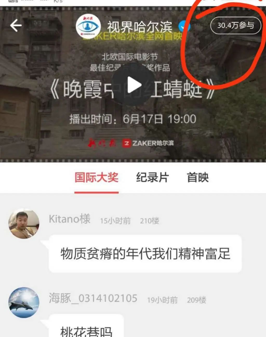 17 日晚 19 时,2020 北欧国际电影节 荣获最佳纪录片导演奖的纪录片《晚霞中的红蜻蜓 一一关于哈尔滨的记忆》在 ZAKER 首映上线,点击量达到 30.4 万 人次(注意:发稿时再改),观众们跟随导演苗萌的镜头,一起穿越回老哈尔滨,体会音乐之城冰雪之都的旧日时光,找回关于哈尔滨的记忆。直播时,数百名观众留言,可见这部国际获奖纪录片的人气。