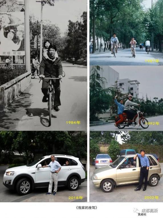 成都电缆厂退休工程师袁顺柱不仅用相机记录下了电缆厂的变迁、高新区数十年来的巨大城市变化,还有自己小家庭的变化。随着生活品质的逐步提高,袁老师家的“座驾”从三十多年前的自行车到现在开上七座轿车,在成都高新区生活的几十年,生活越来越好。