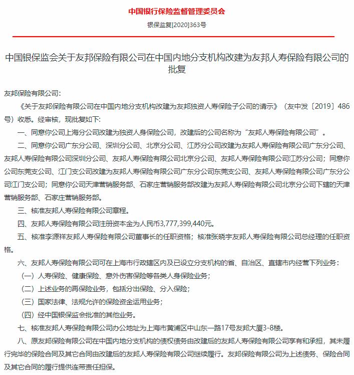 6月19日,中国银保监会批复同意友邦保险上海分公司改建为独资人身保险公司。改建后的公司名称为“友邦人寿保险有限公司”。这也是在中国内地首家获得设立批复的外资独资人身保险公司。
