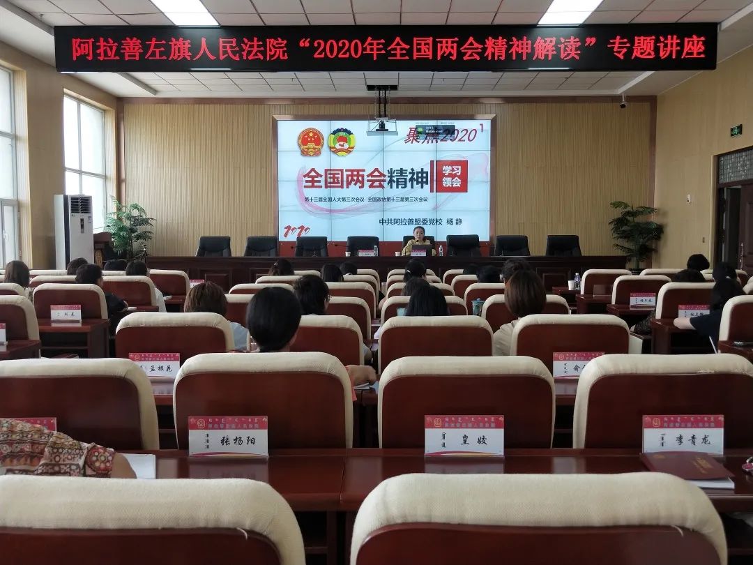 为深刻领会全国“两会”精神,6月19日,阿拉善左旗人民法院举办“2020年全国两会精神解读”专题讲座。此次讲座邀请盟委党校杨静讲师主讲,院领导及全院干警到场聆听。